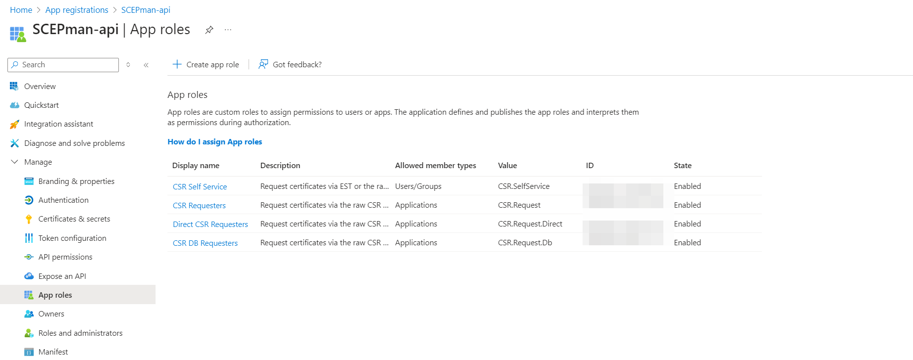 You can check that the Self Service role exists in the SCEPman-api App Registration: