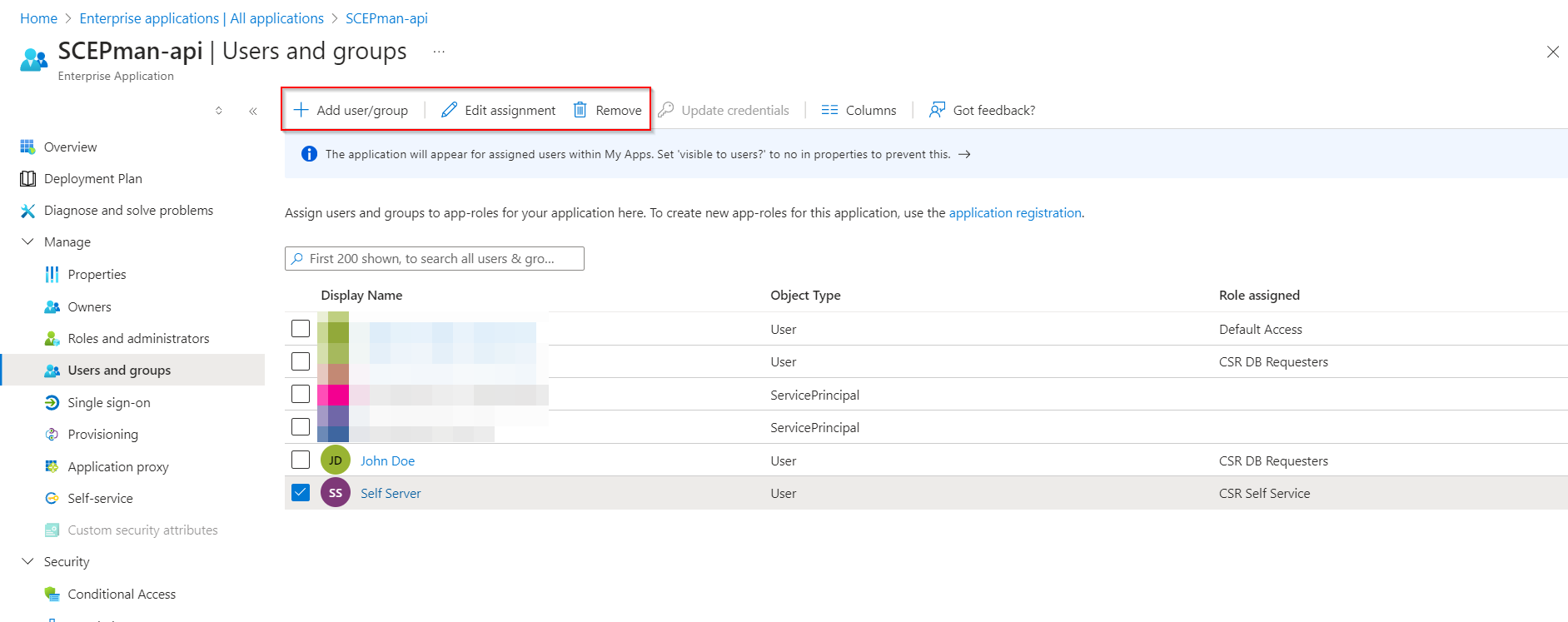 You can create role assignments for users and groups in the SCEPman-api Enterprise Application.&#x20;