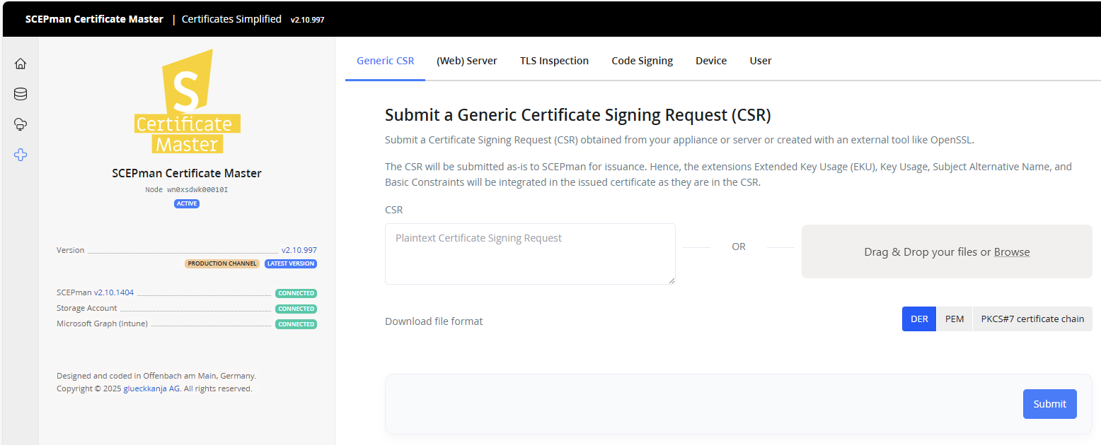 If you have a CSR at hand, navigate to **Submit CSR** in the SCEPman Certificate Master top menu. You can copy and paste the CSR in PEM format (i.e. text) into the text box, or drag and drop the CSR file in binary or PEM format into the grey area at the bottom. You may use the Browse link as well to select a CSR file in binary and PEM format. When using the text box, you have to hit the Submit button afterward to issue the certificate, while uploading a CSR file immediately issues the certificate. Your browser will download the certificate in DER-encoded format.