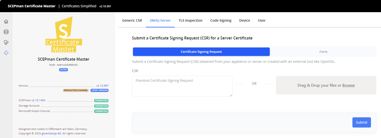 1. Navigate to **New Server Certificate** in the SCEPman Certificate Master top menu&#x20;