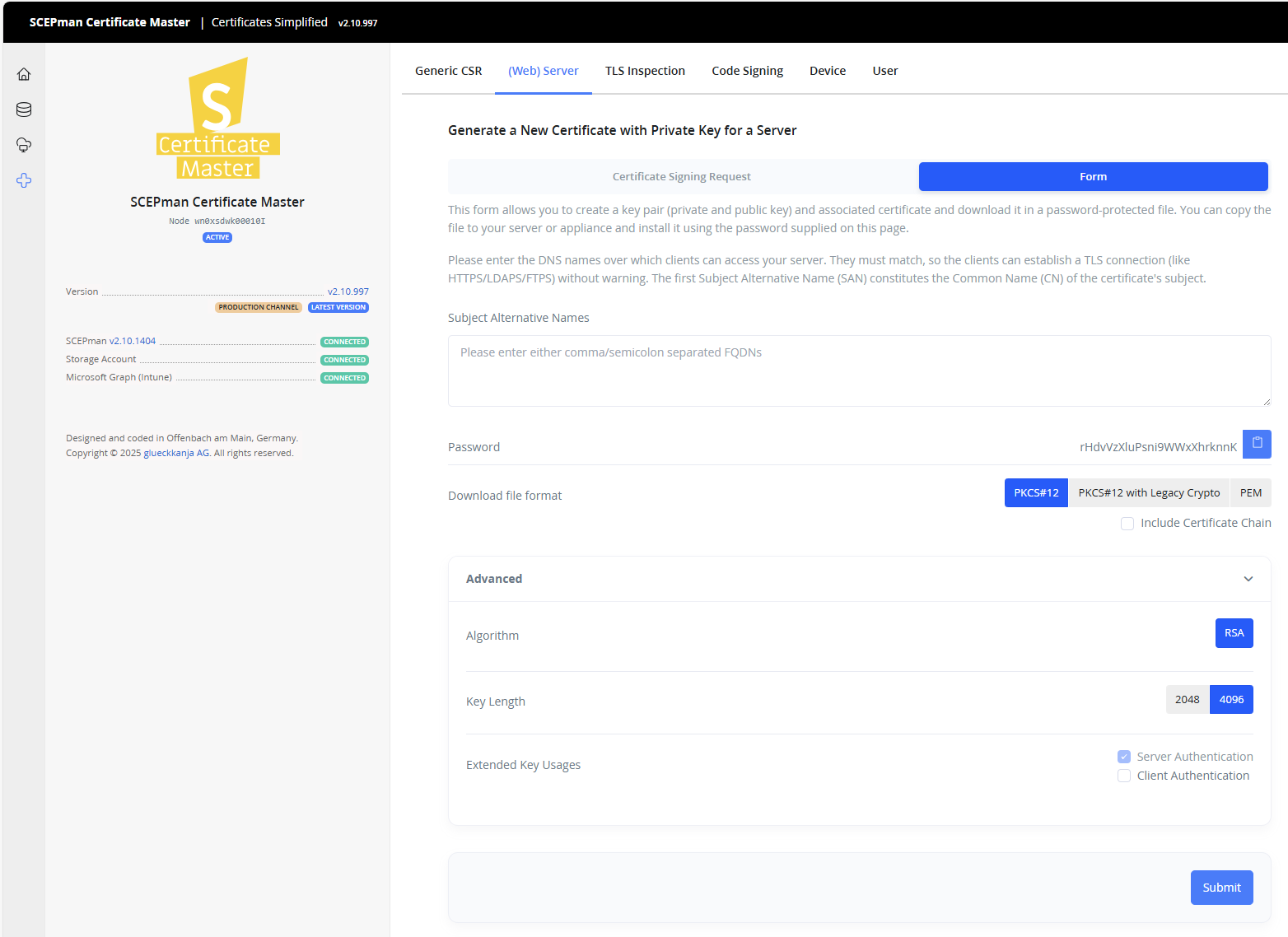 3. Hit **Submit** once you have entered all domain names and the browser will automatically download the certificate with the private key in PKCS#12/PFX format after the certificate was issued a few seconds later. The PKCS#12 file is encrypted with the password shown on the screen. You can import the PKCS#12 directly to the system where it is needed using the password.