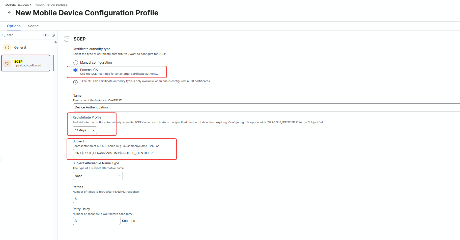 Please add another "Mobile Device Configuration Profile" and choose "SCEP" as payload. Activate "Use the External Certificate Authority settings to enable Jamf Pro as SCEP proxy for this configuration profile" and enter the following information: