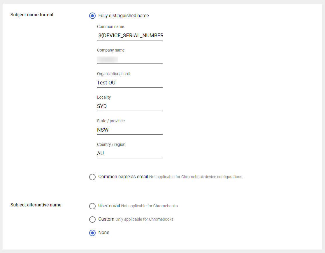 <table><thead><tr><th width="246">Attribute</th><th width="282">Value (Device)</th><th>Value (User)</th></tr></thead><tbody><tr><td><strong>Subject name format</strong></td><td><strong>Fully distinguished name</strong></td><td><strong>Fully distinguished name</strong></td></tr><tr><td></td><td><strong>Common name</strong>: ${DEVICE_SERIAL_NUMBER}</td><td><strong>Common name:</strong> ${USER_EMAIL}</td></tr><tr><td></td><td><strong>Company name</strong>: Your company name.</td><td><strong>Company name</strong>: Your company name.</td></tr><tr><td></td><td><strong>Organisation unit:</strong> Your organizational unit. This is optional.</td><td><strong>Organisation unit:</strong> Your organizational unit. This is optional.</td></tr><tr><td></td><td><strong>Locality</strong>: Your organisation unit's location. This is optional.</td><td><strong>Locality</strong>: Your organisation unit's location. This is optional.</td></tr><tr><td></td><td><strong>State</strong>: Your organisation unit's state. This is optional.</td><td><strong>State</strong>: Your organisation unit's state. This is optional.</td></tr><tr><td></td><td><strong>Country / region</strong>: Your organisation unit's country. This is optional.</td><td><strong>Country / region</strong>: Your organisation unit's country. This is optional.</td></tr><tr><td><strong>Subject alternative name</strong></td><td>Default: <strong>None</strong><br><br>This can be set to <strong>Custom</strong> when the SAN shall be used, e.g. as outer identity when authenticating to a WiFi using EAP-TLS.</td><td><p><strong>Custom</strong></p><p></p><p></p><p></p><p></p><p><strong>User Principal:</strong> ${USER_EMAIL_NAME}</p></td></tr><tr><td></td><td></td><td></td></tr></tbody></table>