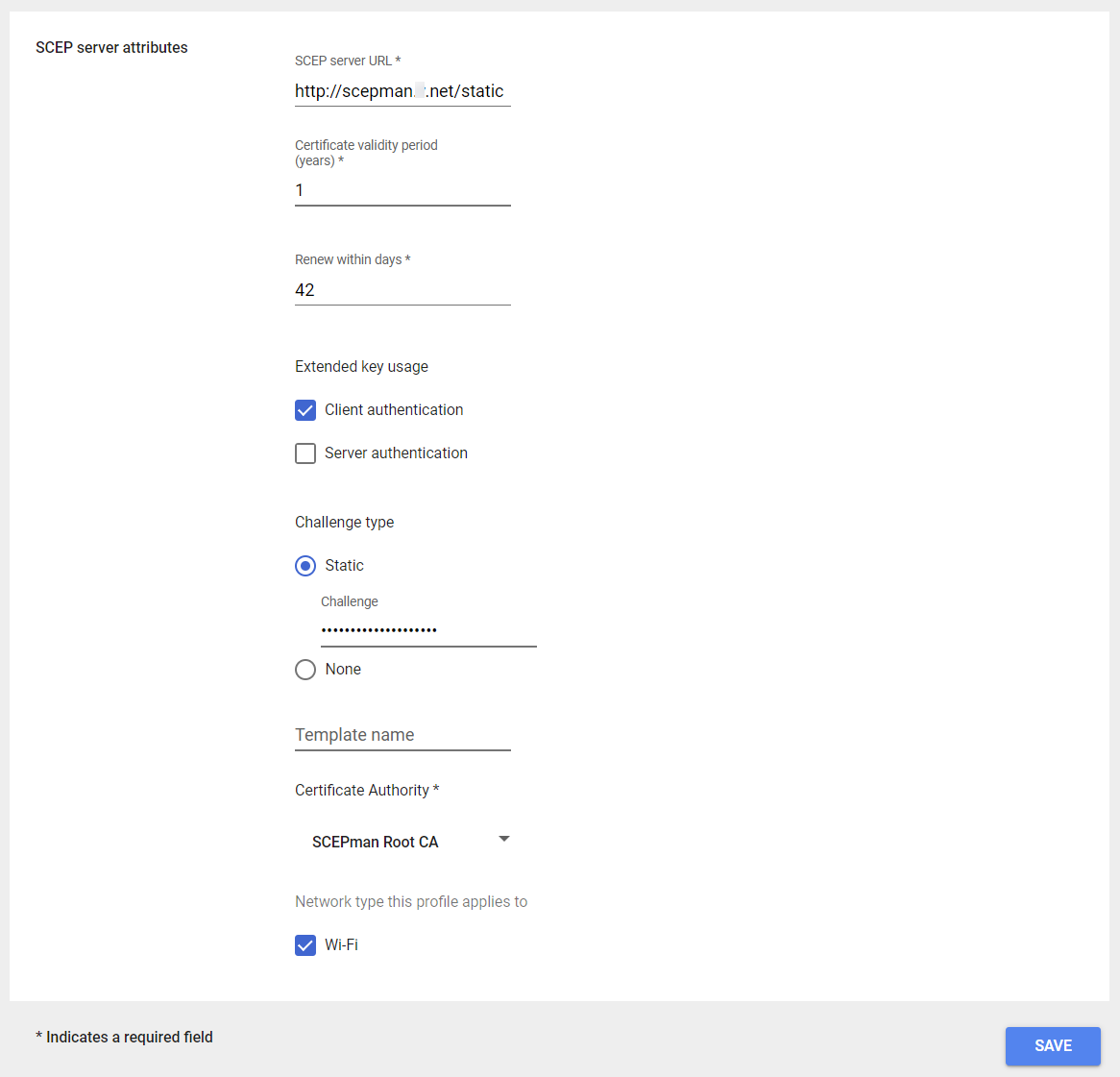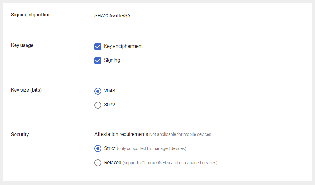 <table><thead><tr><th width="246">Attribute</th><th>Value</th></tr></thead><tbody><tr><td><strong>SCEP server attributes</strong></td><td><strong>SCEP server URL</strong>: <a href="http://scepman.yourdomain.net/static">http://scepman.yourdomain.net/static</a></td></tr><tr><td></td><td><strong>Certificate validity period (years)</strong>: 1</td></tr><tr><td></td><td><strong>Renew within days</strong>: 42</td></tr><tr><td></td><td><strong>Extended key usage</strong>: Client authentication</td></tr><tr><td></td><td><strong>Challenge type</strong>: Static</td></tr><tr><td></td><td><strong>Challenge</strong>: Provide the challenge value you have configured when <a href="..#enable-google-workspace-integration">enabling the SCEPman Google Workspace</a> integration.</td></tr><tr><td></td><td><strong>Certificate Authority</strong>: Reference here the certificate profile containing your <a href="#root-certificate">SCEPman Root CA</a>.</td></tr><tr><td></td><td><strong>Network type this profile applies to</strong>: Wi-Fi</td></tr></tbody></table>