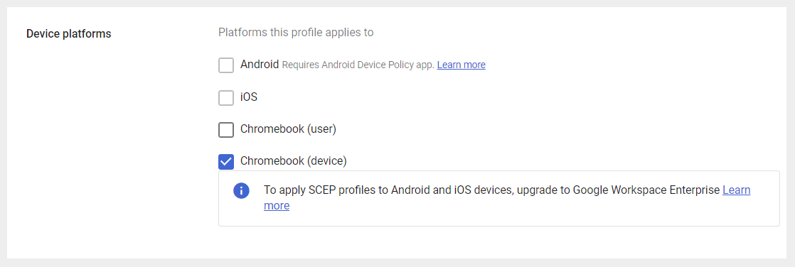 | **Device platforms** | Chromebook (device) | Chromebook (user) |