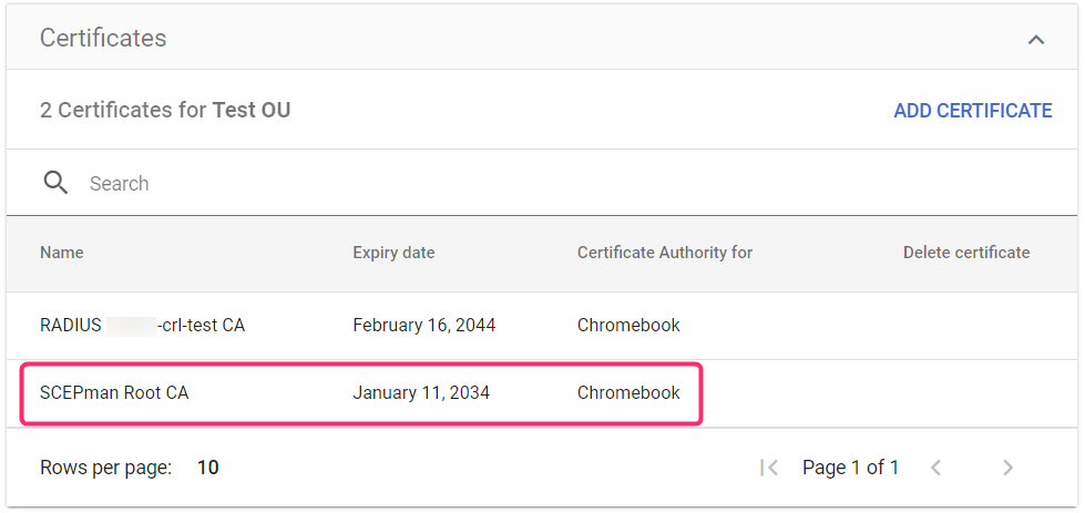 2. Now upload your SCEPmen root CA to your Google Workplace. In your Google **Admin console** (admin.google.com) navigate to **Menu** > **Devices** > **Networks** > **Certificates** > **ADD CERTIFICATE**