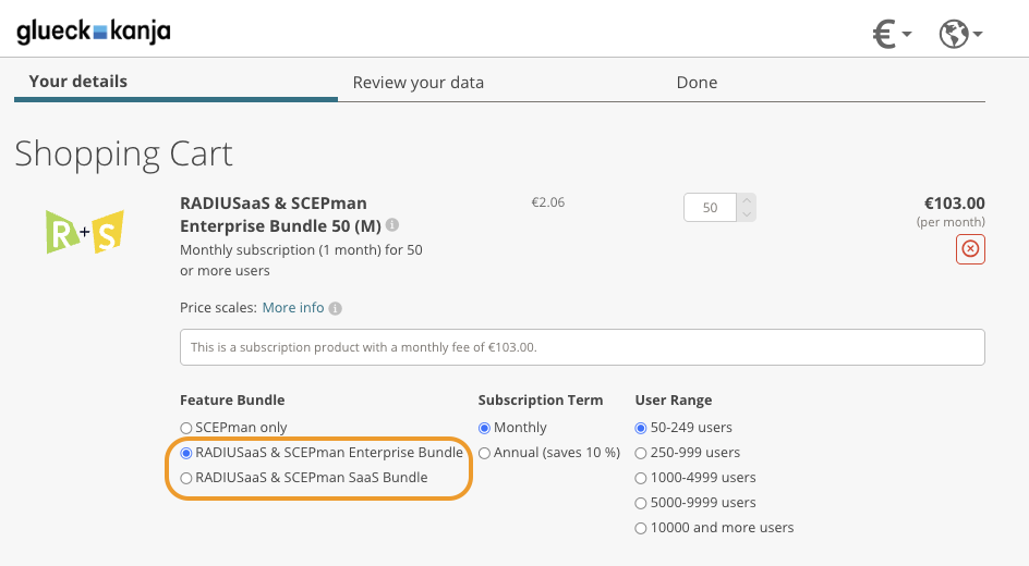 La devise de référence pour SCEPman est l’euro (EUR). Le taux de change que cleverbridge applique lors de la conversion vers d’autres devises n’est pas sous notre contrôle. Veuillez noter qu’une fois qu’une commande d’abonnement est passée **et** tant que **le renouvellement automatique** est **activé**, le taux de change est garanti pour les renouvellements futurs, c’est-à-dire que cleverbridge absorbe le risque de change.&#x20;